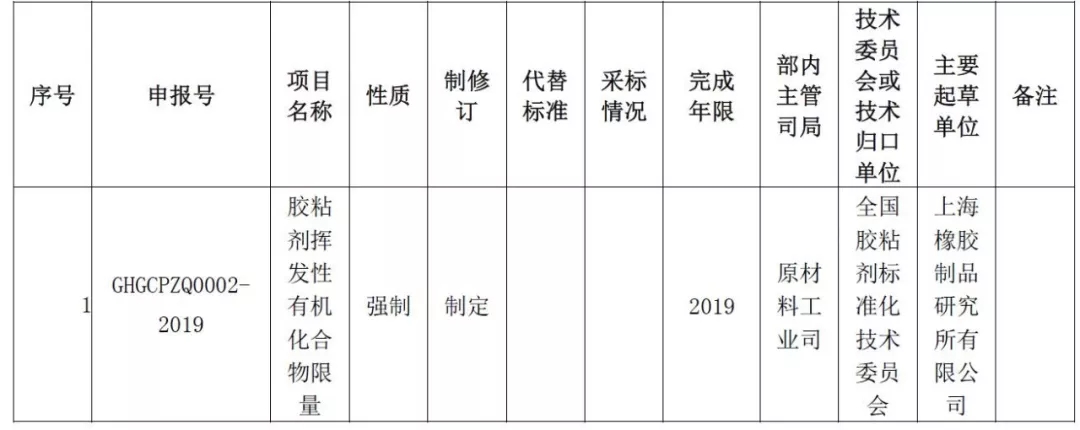 3月21日,工信部官方网站公示了关于《胶粘剂挥发性有机化合物限量》等9项强制性国家标准计划项目,截止日期为2019年4月21日。