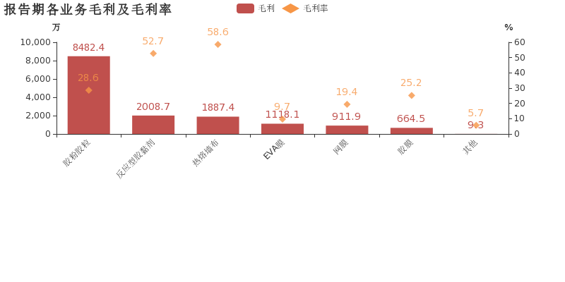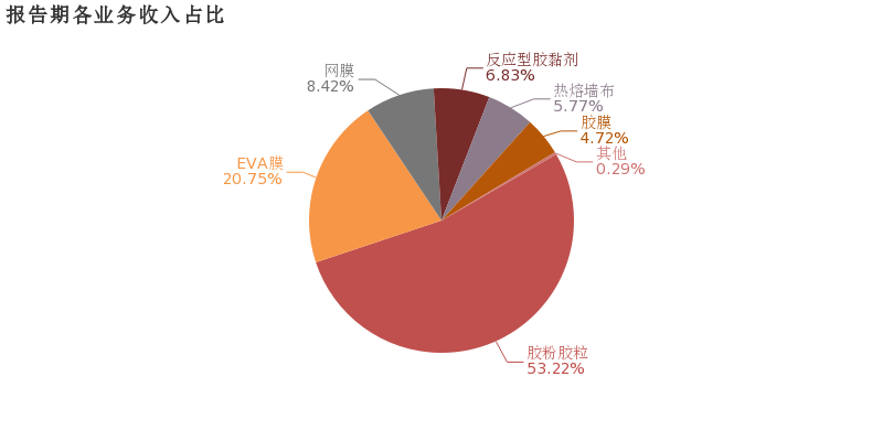 从业务结构来看,“胶粉胶粒”、“EVA膜”是企业营业收入的主要来源。具体而言, “胶粉胶粒”营业收入为3亿,营收占比为53.2%。“EVA膜”营业收入为1.2亿,营收占比为20.7%。“网膜”营业收入为4697.6万,营收占比为8.4%。