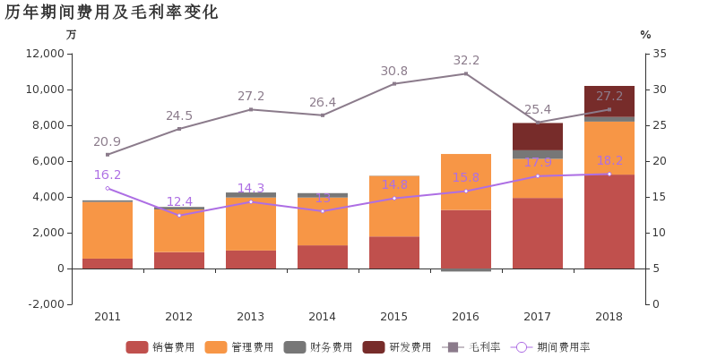 公司2018年期间费用率为18.2%,同去年相比变化不大。期间费用合计达1亿,同比上升25.5%。其中销售费用为5245.7万,同比上升33.1%;管理费用为2960.3万,同比上升35.6%;财务费用为258.7万,同比下降46.3%;研发费用为1735.4万,同比上升14%。营业成本4.1亿,同比增长20.3%,低于营业收入23.2%的增速,导致毛利率上升1.8%。经营性现金流由-429.4万增加至4208.7万,同比上升1080.2%。公司本期研发投入为1735.4万,同比上升14%。研发投入全部费用化,不作资本化处理。