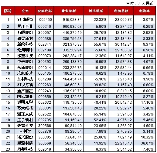 截至4月底,国内薄膜上市公司陆续发布了2018年度报告,从统计的23家企业数据来看,企业营业收入整体向上发展,业绩下滑只有4家。在全球经济不确定,贸易保护主义抬头的背景下,行业能够取得如此佳绩实属不易。但薄膜行业龙头——康得新违约和业绩下滑对整个行业带来较大负面影响。