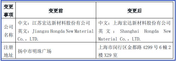 2019年5月27日,江苏宏达新材召开了董事会议,审议通过了《关于变更公司名称、注册地址、经营范围并修改公司章程的议案》。 此前公司已拟将注册地址迁至上海市,现公司根据与上海市当地政府沟通的实际情况,决定变更公司名称、注册地址、经营范围并修改公司章程。