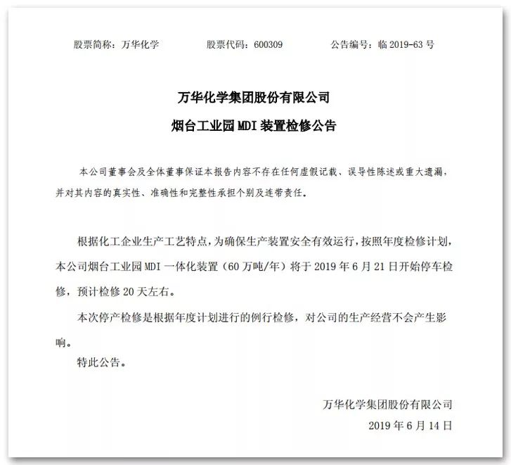 亚太地区最大的MDI制造企业——万华化学集团股份有限公司(以下简称“万华化学”)发布最新公告称,根据化工企业生产工艺特点,为确保生产装置安全有效运行,按照年度检修计划,公司烟台工业园MDI一体化装置(60万吨/年)将于2019年6月21日开始停车检修,预计检修20天左右。