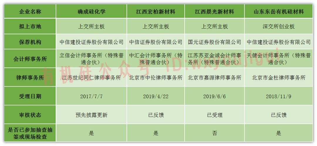 正常排队的企业中有四家有机硅企业位列其中,他们分别是确成硅化学、江西宏柏新材料、江西晨光新材料和山东东岳有机硅材料。目前这四家公司所处的审核状态不一样,为此小编对这四家公司做了整理。