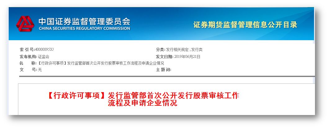 2019年6月21日,证监会披露了受理首发及发行正常排队企业的情况。截止至2019年6月20日,中国证监会受理首发及发行正常排队企业404家,中止审查企业15家,终止审核企业20家。