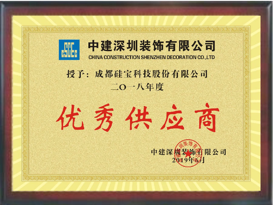 会议隆重宣布2018年度“优秀供应商”名单,硅宝科技凭借优异的产品质量、及时有效的服务,成为有机硅密封胶行业唯一一个获此殊荣的企业。中建深装董事长、党委书记陈鹏为获奖企业代表颁奖,硅宝科技董事长王有治上台领奖。
