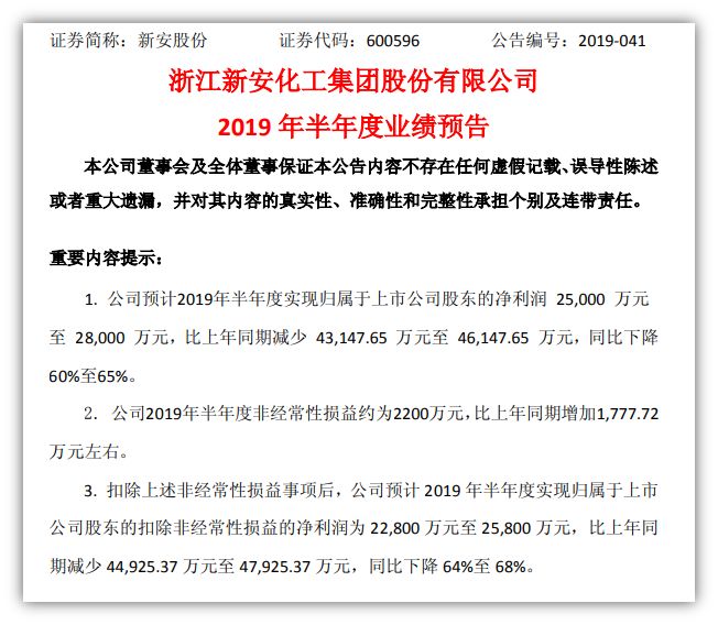 3. 扣除上述非经常性损益事项后,公司预计 2019年半年度实现归属于上市公司股东的扣除非经常性损益的净利润为 22,800万元至25,800 万元,比上年同期减少44,925.37万元至47,925.37万元,同比下降64%至68%。