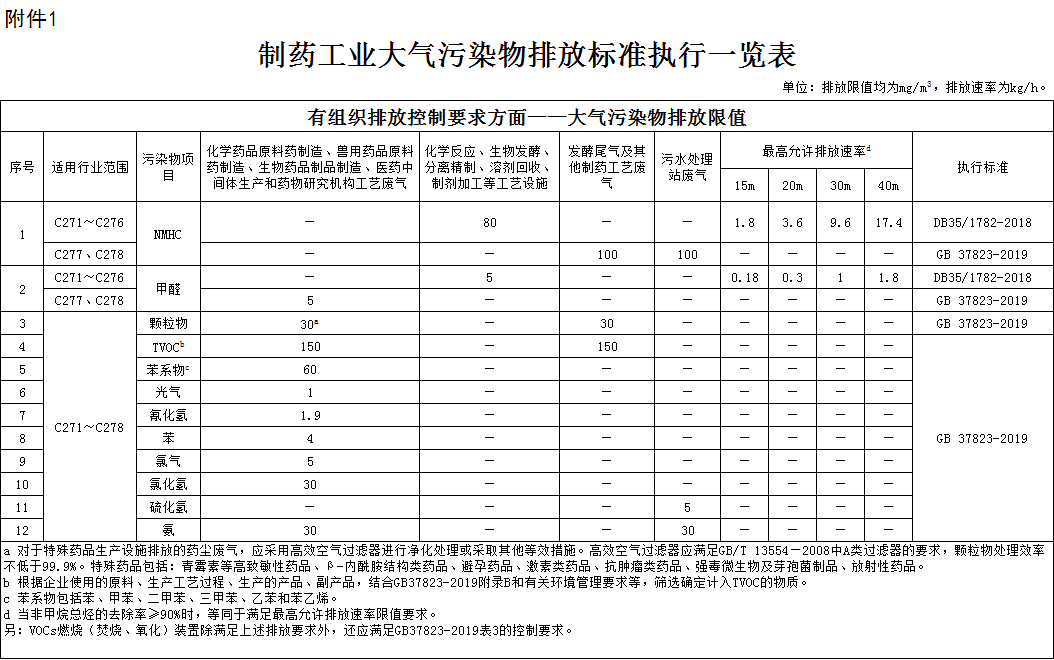属于《国民经济行业分类》(GB/T4754-2017)中C271~C278的行业,其新建企业、现有企业分别于2019年7月1日、2020年7月1日起执行《制药工业大气污染物排放标准》(GB37823-2019);但对于其中的C271~C276类行业,其“化学反应、生物发酵、分离精制、溶剂回收、制剂加工等工艺设施”排气筒的非甲烷总烃、甲醛,“厂区内监控点浓度限值”的非甲烷总烃,以及“企业边界监控点浓度限值”的非甲烷总烃、甲醛等指标排放限值,仍继续分别执行DB35/1782-2018中表1、表2、表3的有关规定。