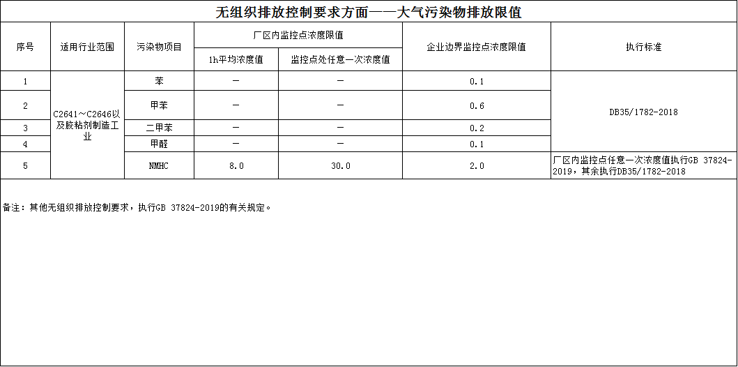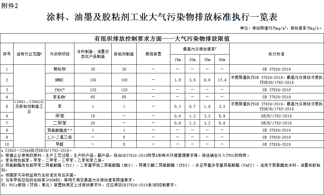 1.属于《国民经济行业分类》(GB/T4754-2017)中C2641、C2642的行业及胶粘剂工业,新建企业、现有企业分别于2019年7月1日、2020年7月1日起执行《涂料、油墨及胶粘剂工业大气污染物排放标准》(GB37824-2019);但对于其排气筒VOCs排放控制,“苯”和“NMHC”最高允许排放速率执行DB35/1782-2018有关规定,并增设甲苯、二甲苯两项指标,继续执行DB35/1782-2018中表1的有关规定;同时,“厂区内监控点浓度限值”的非甲烷总烃,以及“企业边界监控点浓度限值”的非甲烷总烃、苯、甲苯、二甲苯、甲醛等指标排放限值,继续按照DB35/1782-2018中表2、表3的有关规定执行。