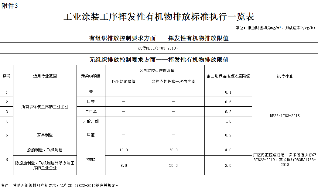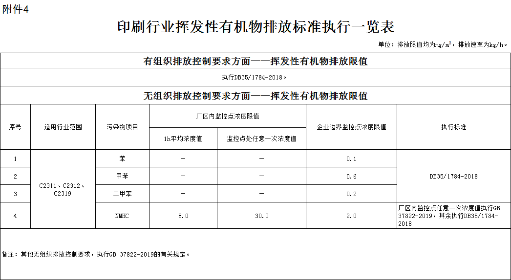 工业涂装工序、印刷行业分别继续执行DB35/1783-2018、DB35/1784-2018;但在无组织VOCs排放控制上,均增加“厂区内监控点处任意一次NMHC浓度值”的控制要求,新建企业、现有企业分别于2019年7月1日、2020年7月1日起执行GB37822-2019附录A的表A.1的相应规定,同时,其他无组织排放控制要求执行GB37822-2019的有关规定。