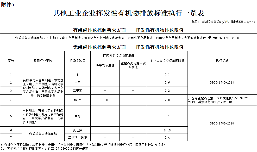 原适用于DB35/1782-2018中的合成革与人造革制造、木材加工、电子产品制造及其他行业(包括有机化学原料制造、农药制造、专用化学产品制造、日用化学产品制造、光学玻璃制造),继续执行DB35/1782-2018;但在无组织VOCs排放控制上,均应增加“厂区内监控点处任意一次NMHC浓度值”的控制要求,新建企业、现有企业分别于2019年7月1日、2020年7月1日起执行GB37822-2019附录A的表A.1的相应规定,同时,其他无组织排放控制要求执行GB37822-2019的有关规定。