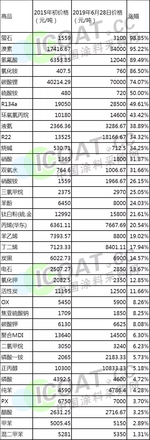 据了解,第一次环保督察时,化工厂关闭,化工原料飞涨,局部地区出现断货情况。除此之外,任何一个突发事故都有可能会造成部分原材料价格异动。近四年来,国内部分化工产品价格涨幅如下: