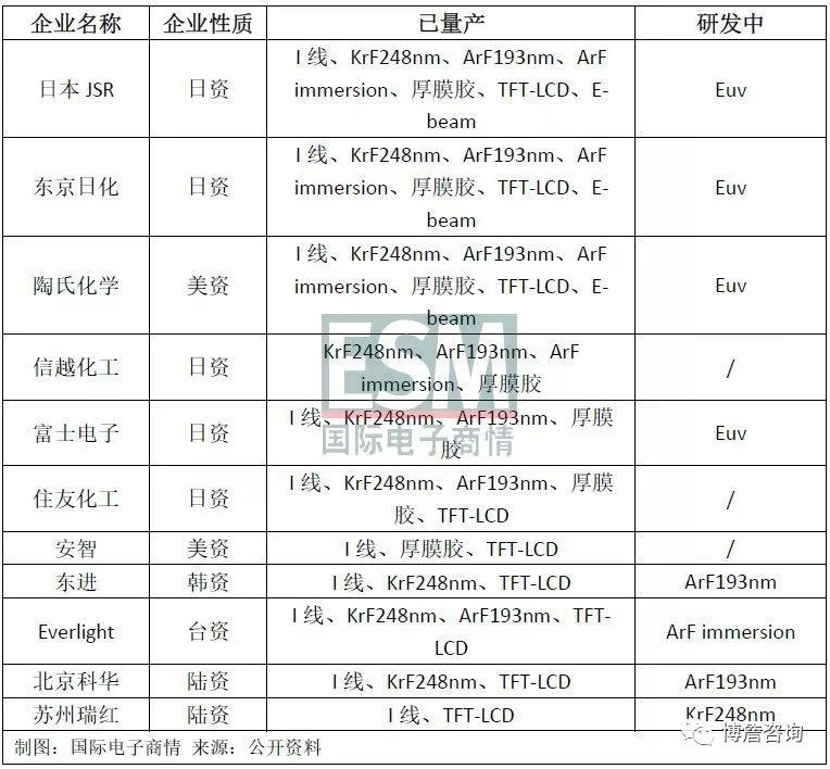 在全球光刻胶市场,日本占有非常重要的位置。全球专利分布前十的公司,有7成是日本企业。其中,日本JSR和东京日化可量产市面上几乎所有的光刻胶产品(EUV光源用光刻胶正在研发中),信越化工、富士电子、住友化工在当下主流的半导体光刻胶领域也有较突出的表现。