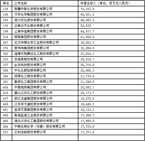 其中,一共有23家化工企业上榜,新疆中泰化学股份有限公司以702.22亿元的总收入排名129位,紧随其后的是万华化学集团股份有限公司,总收入为606.21亿元,排名148位 。金发科技股份有限公司以253.17亿元的总收入排名337位。