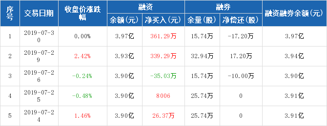 融资方面,当日融资买入757.99万元,融资偿还396.71万元,融资净买入361.29万元。融券方面,融券卖出0股,融券偿还17.2万股,融券余量15.74万股,融券余额66.58万元。融资融券余额合计3.97亿元。