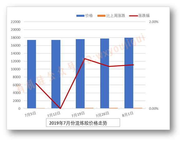 7月,107胶、生胶及混炼胶走势与单体走势基本保持一致,但107胶、生胶价格上涨要比混炼胶迅猛。由于整个7月,单体厂几乎要么检修,要么封盘不报,要么降低开工率,进入7月后,107胶、生胶价格就一路小跑,直到7月后期价格上涨速度才放缓。混炼胶价格上涨速度相对就缓和了很多。截至到8月1日: