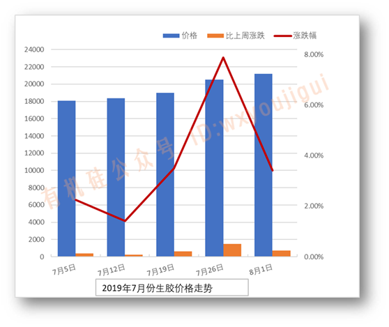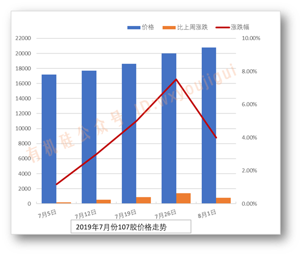 2019年7月,有机硅价格触底反弹,持续上涨,DMC、107胶、生胶涨幅直逼4000元/吨。7月,单体厂家平均开工率在85%左右,多个单体及硅胶企业在7月安排了设备的检修。多家单体及硅胶企业封盘不报,整个有机硅市场呈现出有价无市的局面。