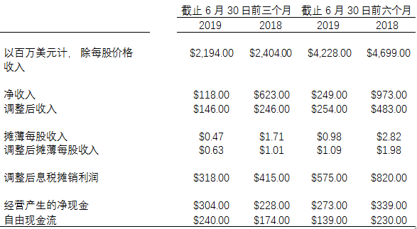♦ 2019年第二季度调整后的净收入为1.46亿美元,去年同期为2.46亿美元。2019年第二季度调整后的每股摊薄收益为0.63美元,去年同期为1.01美元。