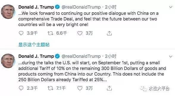 美国总统特朗普1日下午通过社交媒体表示,美国将从今年9月1日起,对从中国进口的3000亿美元商品加征10%的关税。不过,特朗普表示,将就全面的贸易协议与中国继续进行建设性的对话,中美两国的未来将是非常光明的。