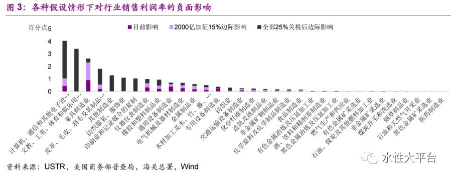 据光大证券测算,在非常悲观的情景假设下,如果全部中国对美出口商品被加征25%的关税的情况下,部分行业销售利润率边际上会受到非常大的影响,文教、美工、体育和娱乐用品制造业、计算机、通信和其他电子设备制造业等影响居前。