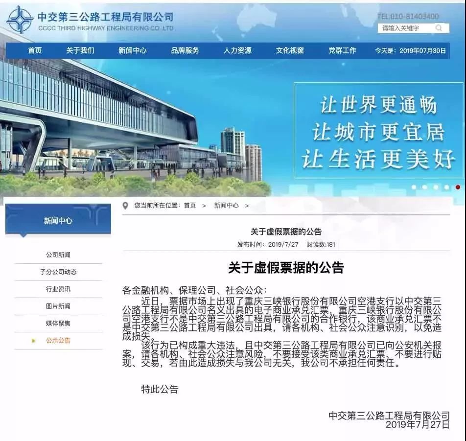 据了解,重庆三峡银行股份有限公司空港支行不是中交第三公路工程局有限公司的合作银行。中交第三公路工程局有限公司也已向公安机关报案,并发布公告提醒各机构、社会公众注意风险,不要接受该类商业承兑汇票、不要进行贴现、交易。