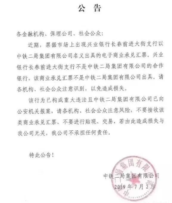 据悉,在上个月,中铁二局出现大概1亿多元的假承兑汇票,目前已经立案侦查中。中铁二局集团有限公司在事发后发布紧急公告称:近期票据市场上出现兴业银行长春前进大街支行,以中铁二局集团有限公司名义出具的电子商业承兑汇票,这批电子商业承兑汇票出票人为“中铁二局集团有限公司”,开户行为“兴业银行长春前进大街支行(以下简称前进大街支行)”。