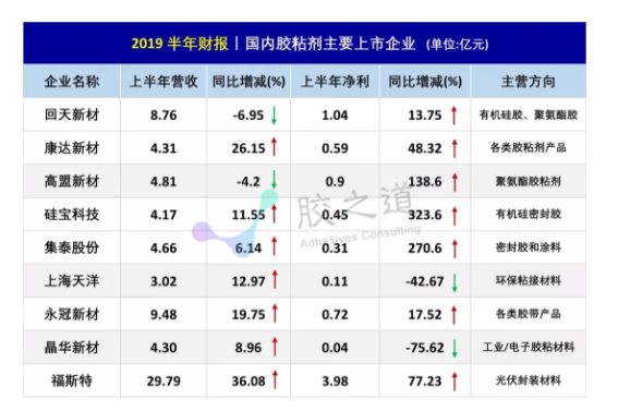近日,回天、康达、高盟、硅宝……共计9家国内胶粘剂主要上市企业公布半年报,总趋势呈现盈利情况。较去年同期相比,共计7家企业净利润实现增长,其中,最高增长幅度达323.6%。