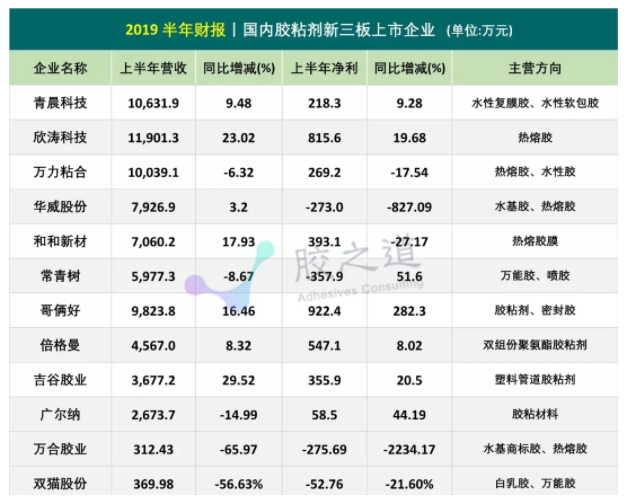 近日,青晨科技、欣涛科技、万力粘合、华威股份、和和新材……共12家国内胶粘剂主要新三板上市企业公布半年报,总趋势呈现盈利情况。较去年同期相比,共计7家企业净利润实现增长,其中,最高增长幅度达282.3%。