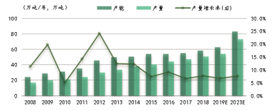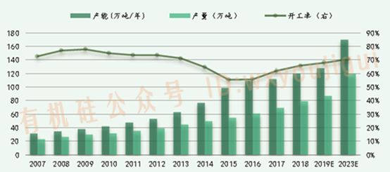 根据SAGSI年报数据分析,中国 HTV产能在2011 、2012年增长较快,产能速维持在10% 以上,随后几年呈下滑的趋势。但这一趋势在2018年回暖,产能、产量及开工率都有明显的上升,2019年随着中国建筑业的稳健增长及其带动的冰箱、彩电、空调等家电消费的增长,市场对HTV的需求会有进一步的上升。SAGSI预测2019年,中国的HTV产能将达到62.6万吨/年,同比增长7.6%,产量将达到54.0万吨/年,同比增长6.7%。