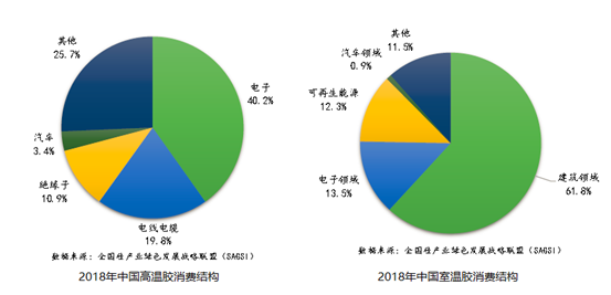 有机硅橡胶的需求的增长主要来源于其下游应用行业如建筑业、汽车制造及交通运输业、电子信息及电力、太阳能能源产业等的强劲发展。有机硅高温胶HTV最大的应用领域是电子行业,适用于制作按键胶。按键中用到HTV的产品主要有手机、彩电、空调、电子计算机等。有机硅室温胶RTV的最大的消费对象是建筑行业, 主要应用包括建筑幕墙、房屋建筑的密封和门窗节能玻璃加工三个方面。