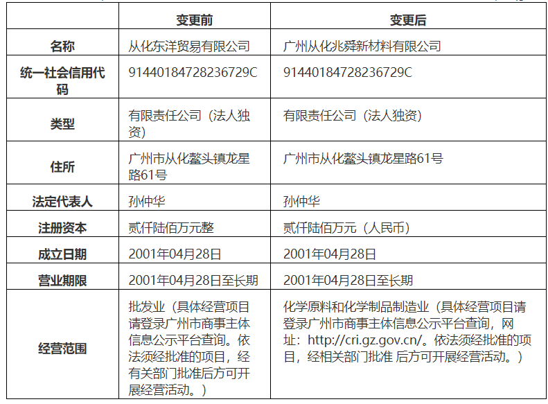 集泰股份于2019年9月5日接到公司全资子公司从化东洋贸易有限公司(以下简称“东洋贸易”)的通知,为适应企业发展需求,东洋贸易变更其企业名称和经营范围,并于近日取得了广州市从化区市场监督管理局换发的《营业执照》。东洋贸易变更前后《营业执照》的主要信息如下: