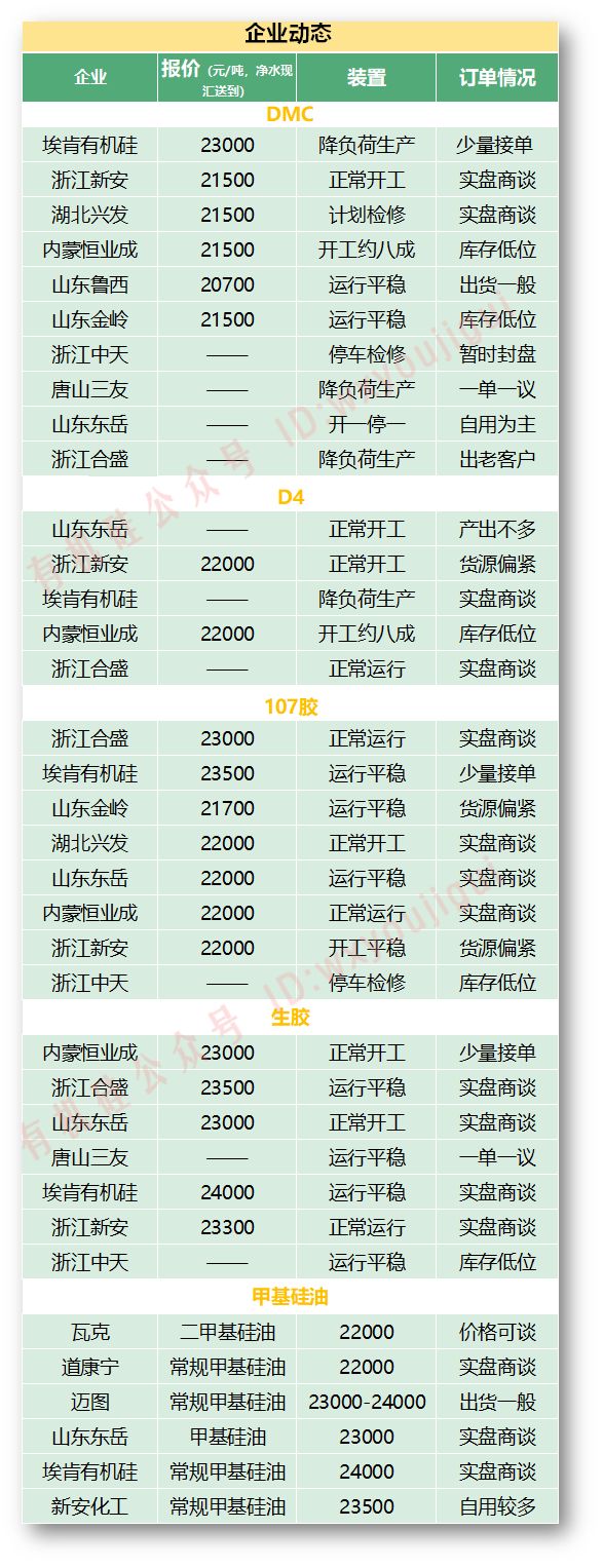 由于库存不高,单体企业挺价明显,后期随着国庆假期到来,下游或将提前备货,预计短期内有机硅价格将维稳为主。