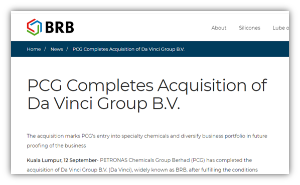 2019年9月12日,马来西亚国家石油化学集团(PCG)宣布对达文西公司(Da Vinci Group B.V.)进行全资收购,从此达文西公司正式成为PCG公司的全资子公司。此次收购标志着PCG公司正式涉足特种化学品领域,并在未来的市场中实行多元化发展战略。