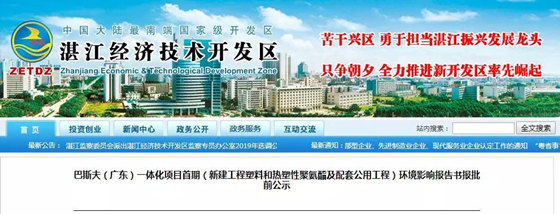 9月5日,湛江经济技术开发区发布“巴斯夫(广东)一体化项目首期(新建工程塑料和热塑性聚氨酯及配套公用工程)环境影响报告书报批前公示”。