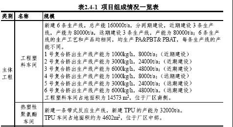 本项目为巴斯夫(广东)一体化项目的首期,总投资2.196亿美元,折合人民币15.6419 亿元,新建工程塑料和热塑性聚氨酯及配套公用工程。本项目主要产品为工程塑料(聚对苯二甲酸丁二酯(PBT)和聚酰胺(PA)、已二酸丁二醇酯和对苯二甲酸丁二醇酯的共聚物(PBAT))和热塑性聚氨酯。其中工程塑料共建设6 条生产线,总产能为16 万吨/年,其中近期建设3 条生产线,产能为8 万吨/年,远期建设3 条生产线,产能为8 万吨/年。热塑性聚氨酯建设1条生产线,产生为3.2 万吨/年。