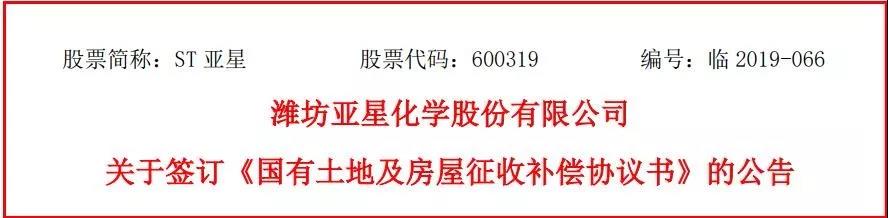 据悉,亚星化学于2019年9月2日收到潍坊市人民政府办公室下发的《关于做好潍坊亚星化学股份有限公司寒亭生产厂区搬迁关停相关工作的通知》,根据《通知》要求,公司现有生产厂区已2019年10月31日全面停产。位于寒亭区民主街529号,土地面积585,215 ㎡,为国有土地,地上附着物征收面积约12.8万㎡。根据依法程序评估结果和房屋征收补偿有关规定,被征收单位合计补偿款总额为人民币14.2亿元。截至目前,亚星化学已前期收到本协议项下补偿款1.6亿元。该公司公告表示,这1.6亿元补偿款暂在非流动负债列示,预计对本年度经营业绩不产生影响。同时,亚星化学方面表示,本次与潍坊市寒亭区住房和城乡建设局签订《国有土地及房屋征收补偿协议书》,有利于加快推进新厂区建设,力争早日恢复生产,确保顺利搬迁和平稳过渡。