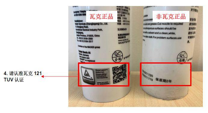 瓦克密封胶的正品外包装上均印有WACKER 和“ 瓦克”注册商标,以及清晰的中英文产品描述。