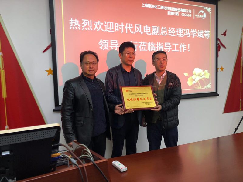 2020年03月18日,株洲时代新材料科技股份有限公司(以下简称“时代新材”)风电副总经理兼总工程师冯学斌一行在公司总经理兼总工程师姚其胜、副总经理王志华的陪同下莅临康达研发中心进行技术交流,同时向公司颁发了“优秀服务供应商奖”,向风电事业部副总监赵兵颁发了“优秀个人服务奖”。