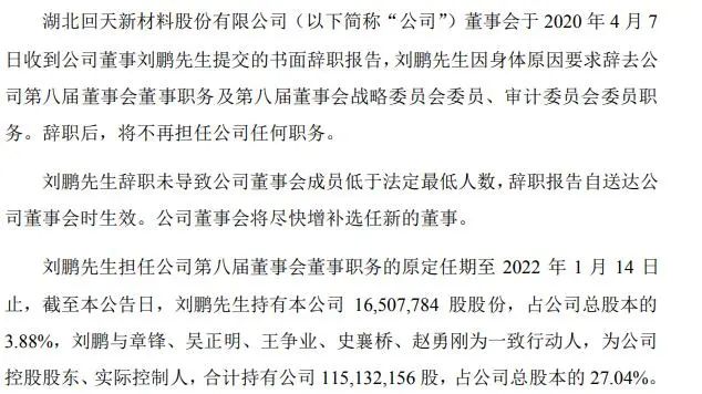 回天新材(300041)董事会于2020年4月7日收到公司董事刘鹏提交的书面辞职报告,刘鹏因身体原因要求辞去公司第八届董事会董事职务及第八届董事会战略委员会委员、审计委员会委员职务。辞职后,将不再担任公司任何职务。