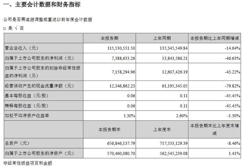 净利:738.86万元 同比变化:-46.63%