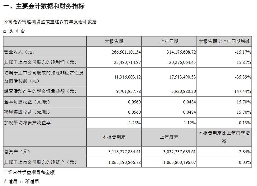净利:2348.07万元 同比变化:15.81%
