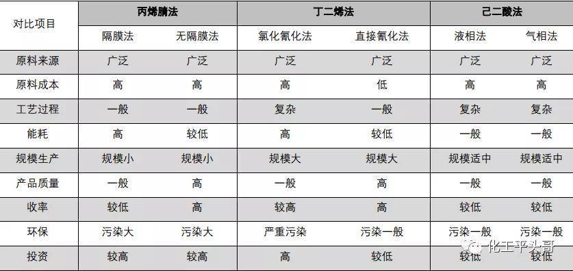 ● 除上述三种生产工艺外,还有己内酰胺法、糠醛法和乙炔法等。其中己内酰胺法是日本东丽公司开发的以己内酰胺为原料,降解后水解生产己二腈的工艺路线。只是这些工艺路线目前未形成规模化生产,不足以在世界市场产生较深远的影响。