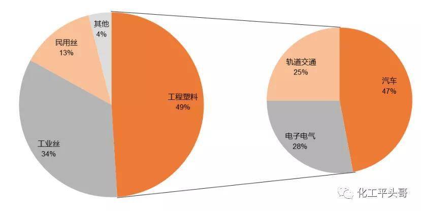 ● 2018年中国PA66的表观消费量为52万吨,约占全球总消费的23%。其中工程塑料占到49%,工业丝占到34%,民用丝占到13%,其他应用占到4%。工程塑料是PA66最大的下游,大约有47%的PA66工程塑料用于汽车行业,其次是电子电气(28%)和轨道交通(25%)。