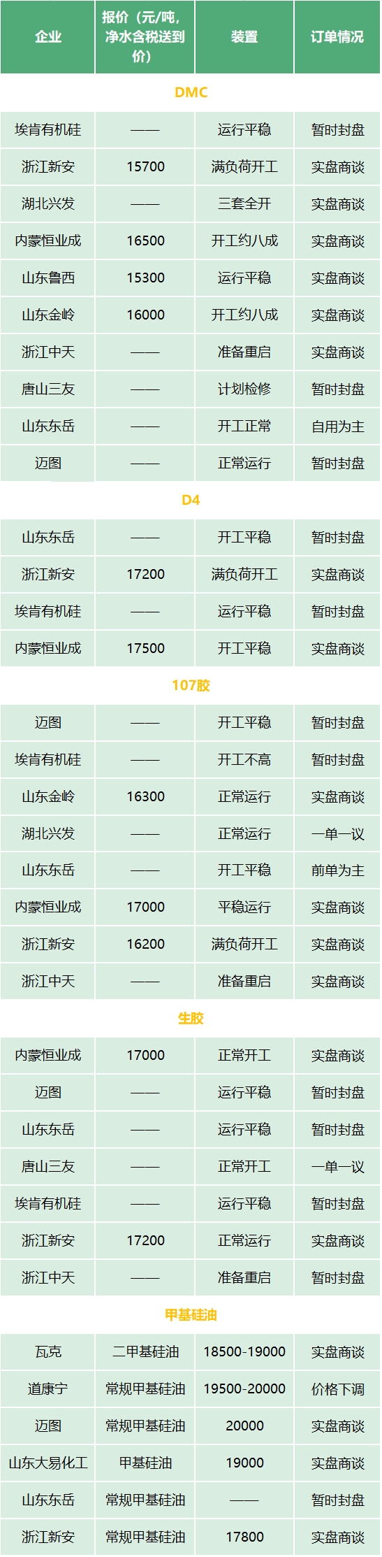 | 硅油:维稳为主,外贸硅油价格调涨,下游多数维持刚需采购。 |