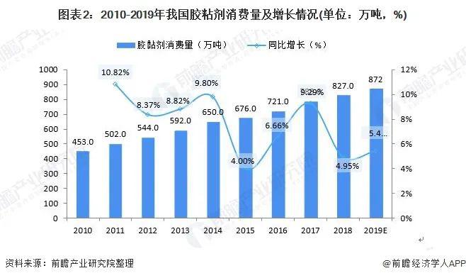 我国胶黏剂工业起步晚,但发展迅速。中国胶黏剂工业从1958年起步,当初在世界胶黏剂领域的份额几乎为零,经过60年的发展,中国胶黏剂已经在世界胶黏剂领域占有一席之地。2019年,行业消费量达到约872万吨,同比增长5.43%。