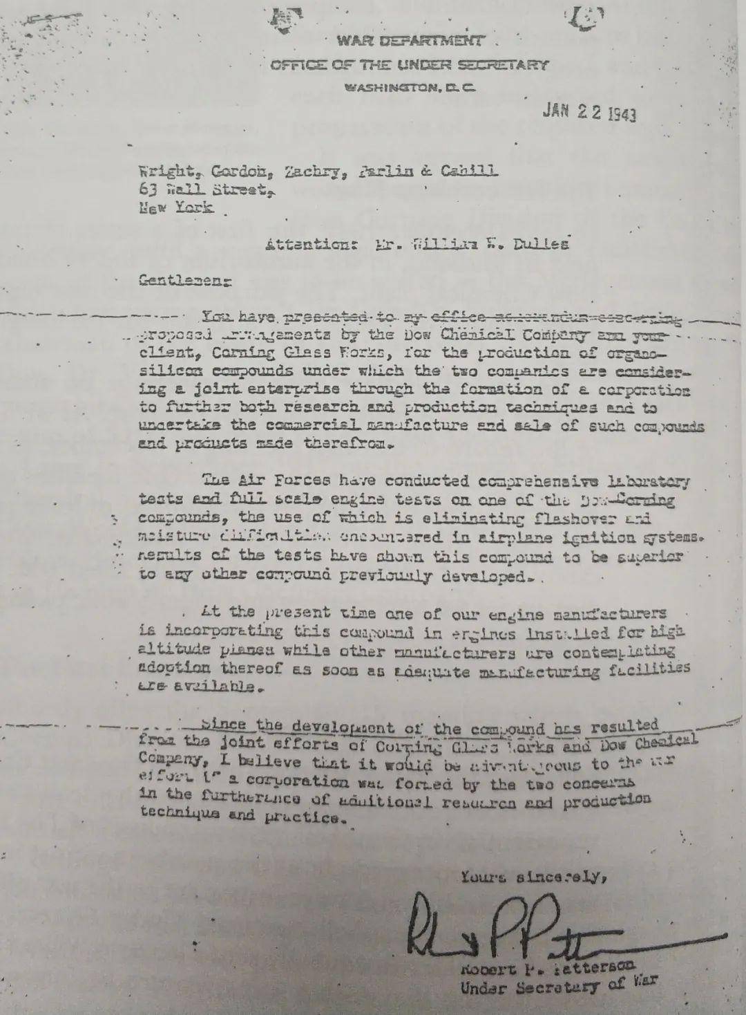 几乎没有公司是在政府部门的“敦促”下成立的。但是正是由于Robert Patterson给Willard Dow写的这封信(见下图),1943年2月9日,康宁玻璃厂和陶氏化学双方的代表正式签订了合作协议,成立了道康宁公司。