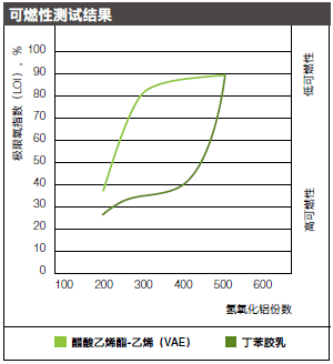 测试结果表明,较之传统的丁苯乳液,瓦克的VINNAPAS® 威耐实® VAE 共聚物乳液能够以较低的成本实现同等的阻燃性能,因为VINNAPAS® 威耐实®乳液配方中氢氧化铝(ATH )的含量较低。通过对含氢氧化铝(ATH)的化合物进行极限氧指数(LOI)测试,可证实以上结果。