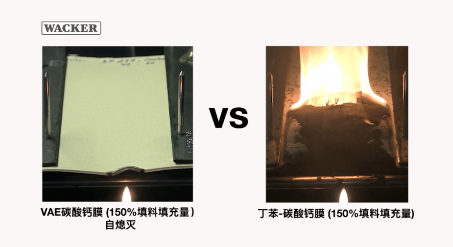 与丁苯乳液相比,VINNAPAS® 威耐实® VAE 共聚物乳液的可燃性较低。在通风柜中按DIN4102-1 标准检测聚合物/碳酸钙薄膜的可燃性。结果表明,丁苯乳液薄膜易于燃烧,并释放 黑色的浓烟;而VAE 薄膜有的只是 轻微燃烧 ,释放 白色的轻烟 ,会自然熄灭。