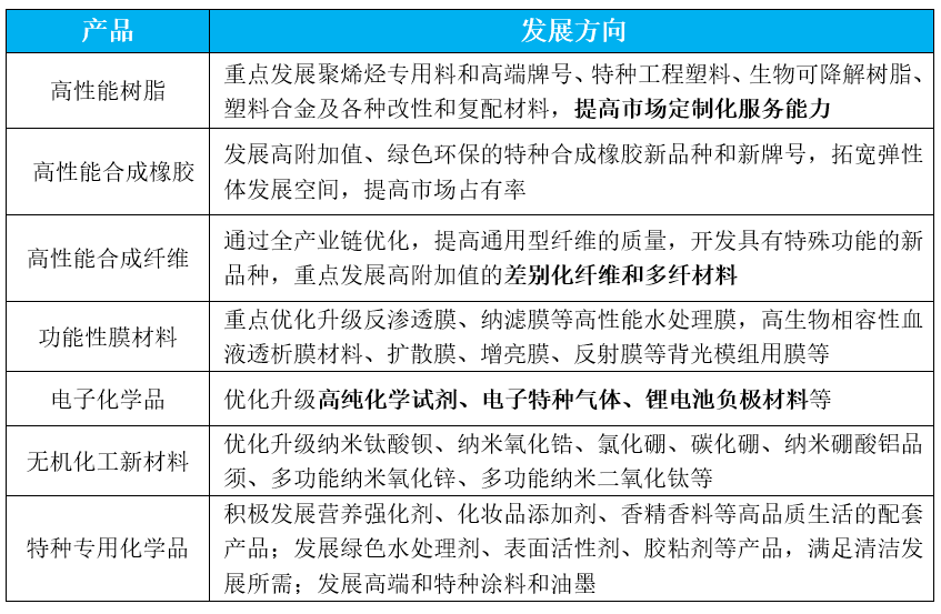 表2 化工新材料和特种专用化学品发展方向