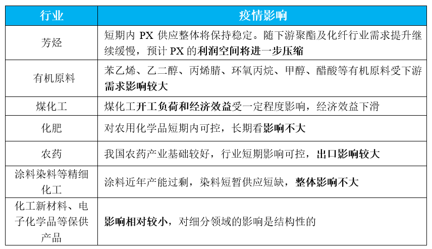 表1 疫情对石化各行业的影响