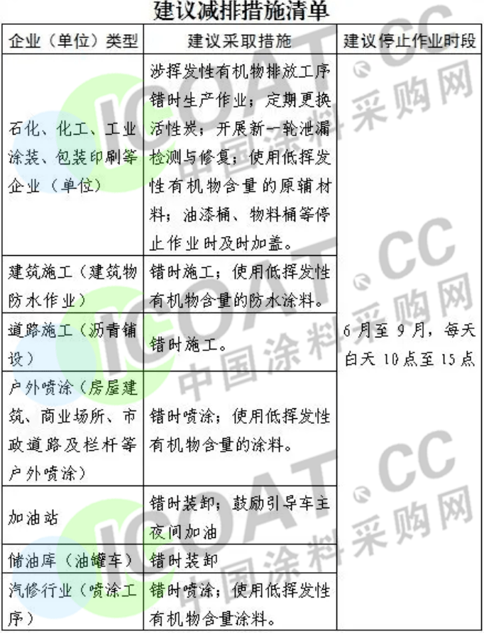 7月至9月原则上不安排沥青道路摊铺、道路划线、大面积建筑外墙涂刷、钢结构涂刷等涉及挥发性有机物排放的市政作业;5月至9月当预报为臭氧污染日时,12时至18时城市建成区内产生挥发性有机物的市政作业停工(应急抢险工程除外);鼓励全市船舶制造、家具制造、印刷、沥青混凝土等行业企业错时生产,在7月至9月的12时至16时停用喷涂、印刷等有挥发性有机物排放的工序。